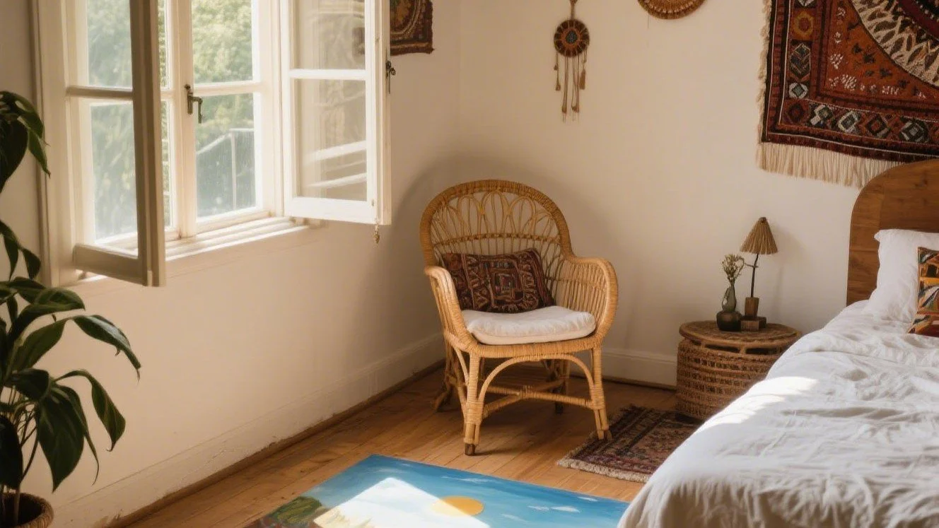“I want a peaceful bedroom where I can unwind with soft lighting and a cosy chair by the window. I need blackout curtains, built-in storage, and a calming colour palette. I don’t want clutter, but I want warmth and texture. My style leans towards the bohemian. This room should feel like a retreat.”