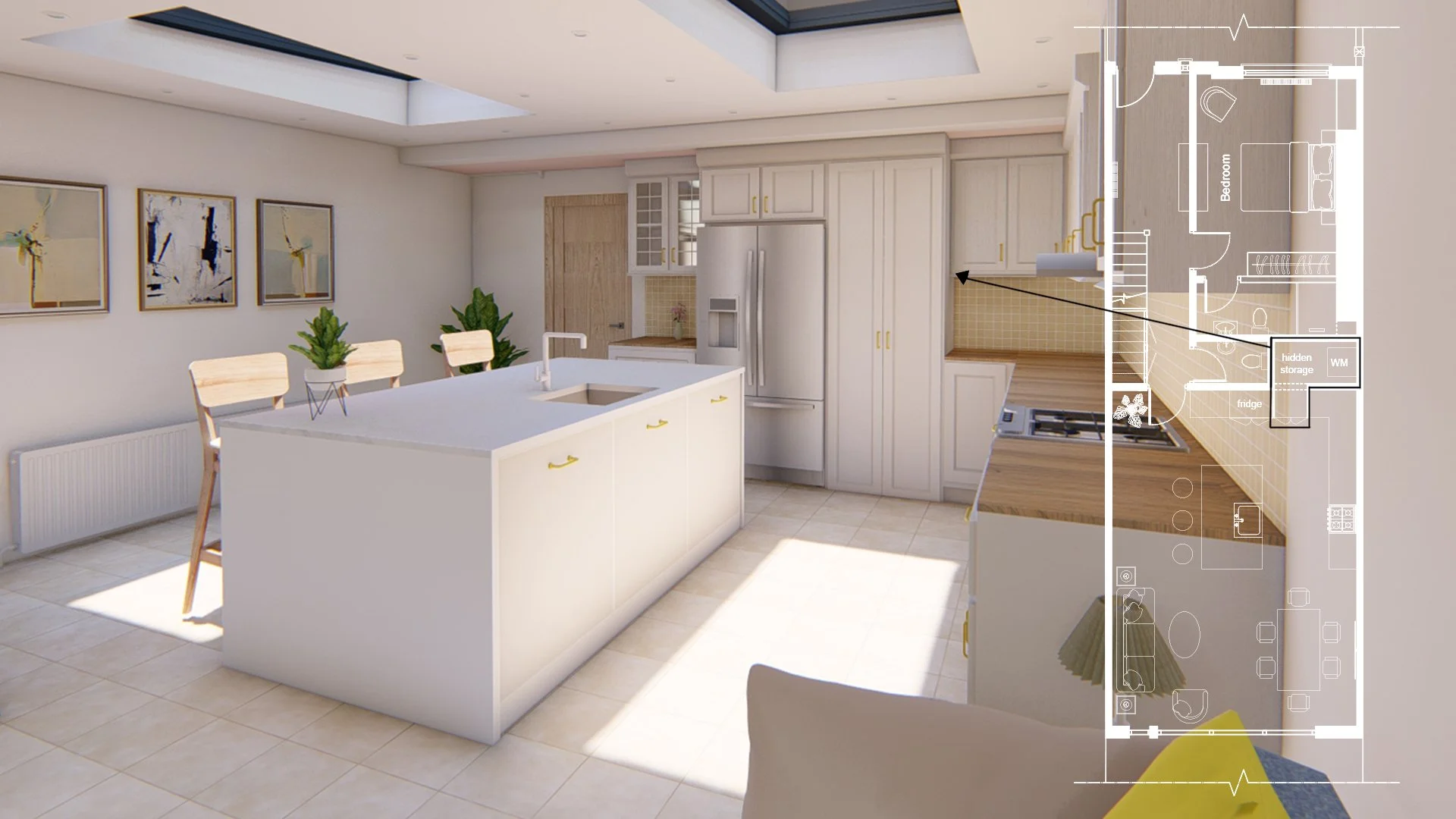 Separate hidden storage, planned in kitchen design in Southcroft Road Project