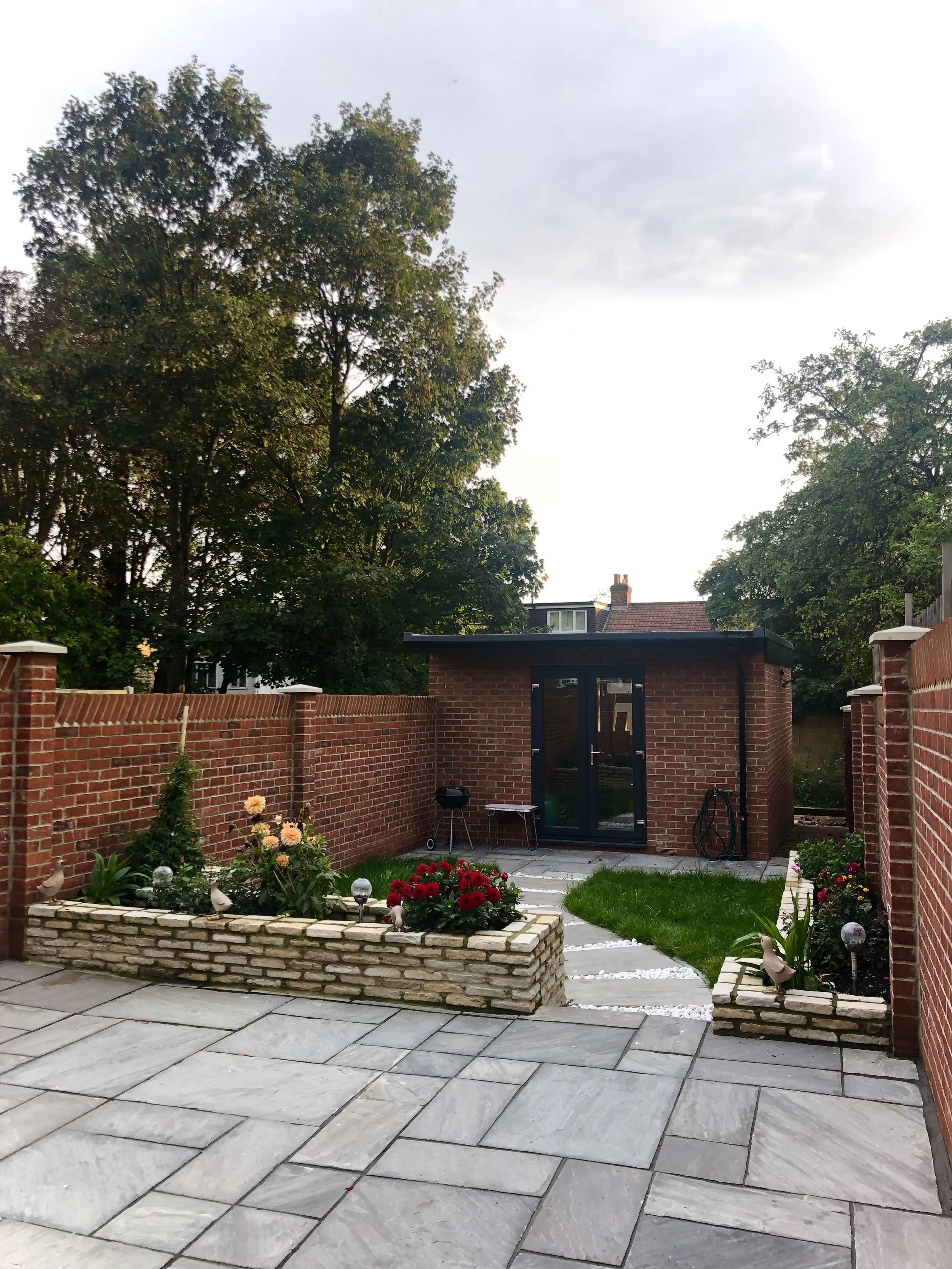 The rear extension was designed as a true continuation of the garden, with red brick used consistently across the extension facade, fencing, and garden shed to unify the architecture with the landscape.