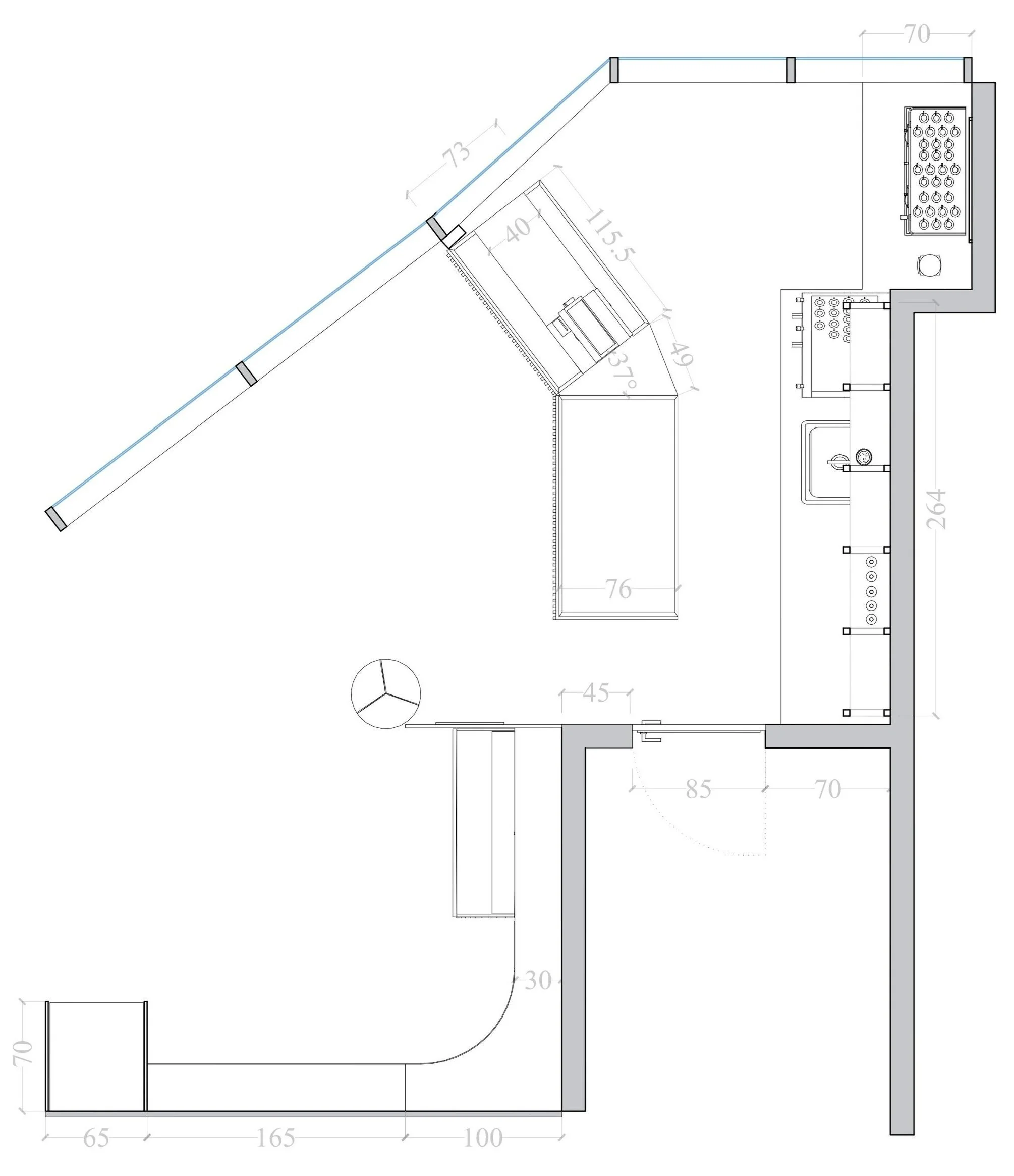 The fridge arrangement not only facilitates easy access but also allows for additional shelving and a discreetly integrated waste area. Behind the counter, the layout maximises functionality, accommodating cold storage, a sink, and coffee-making equipment within a compact footprint.