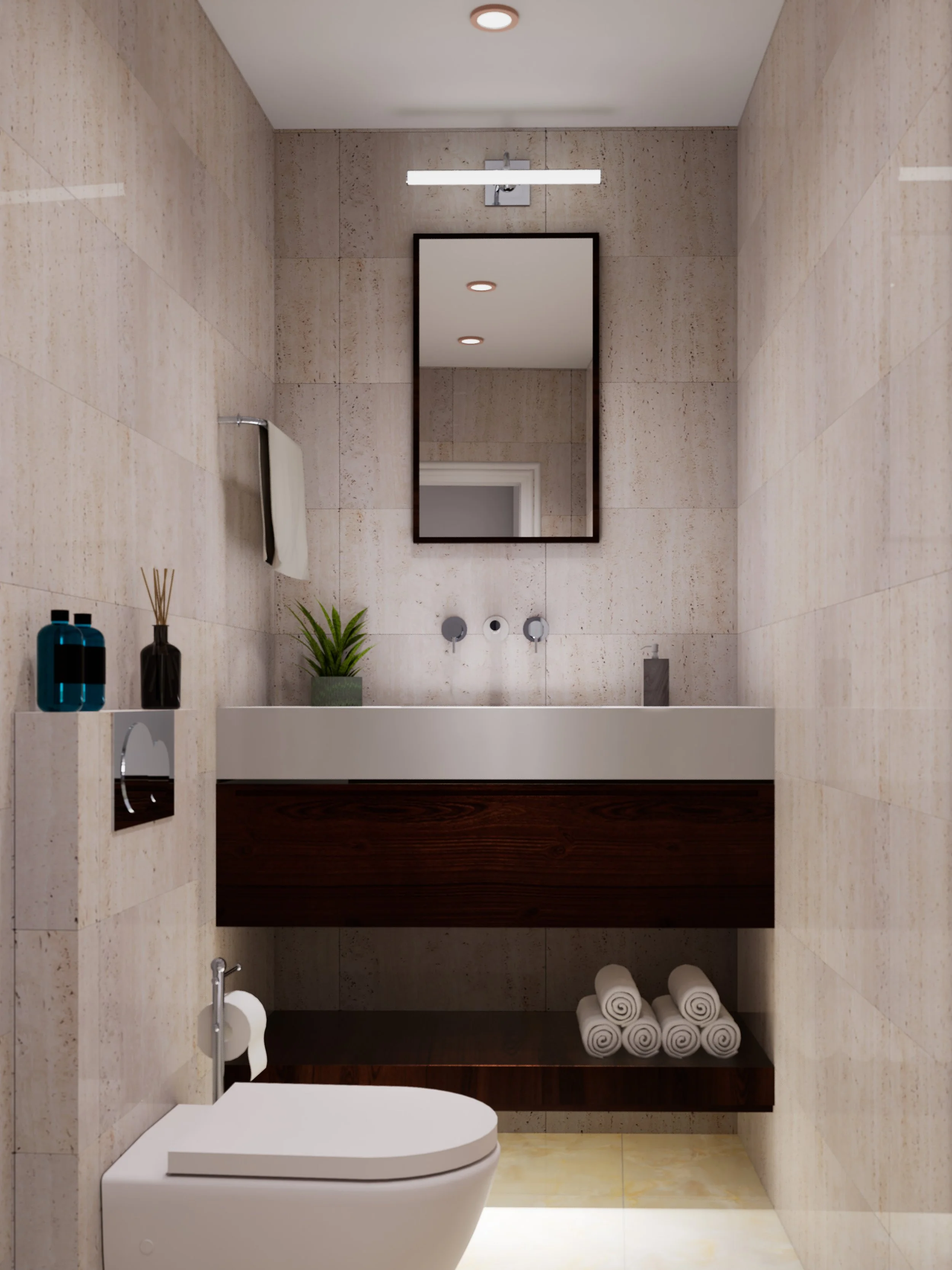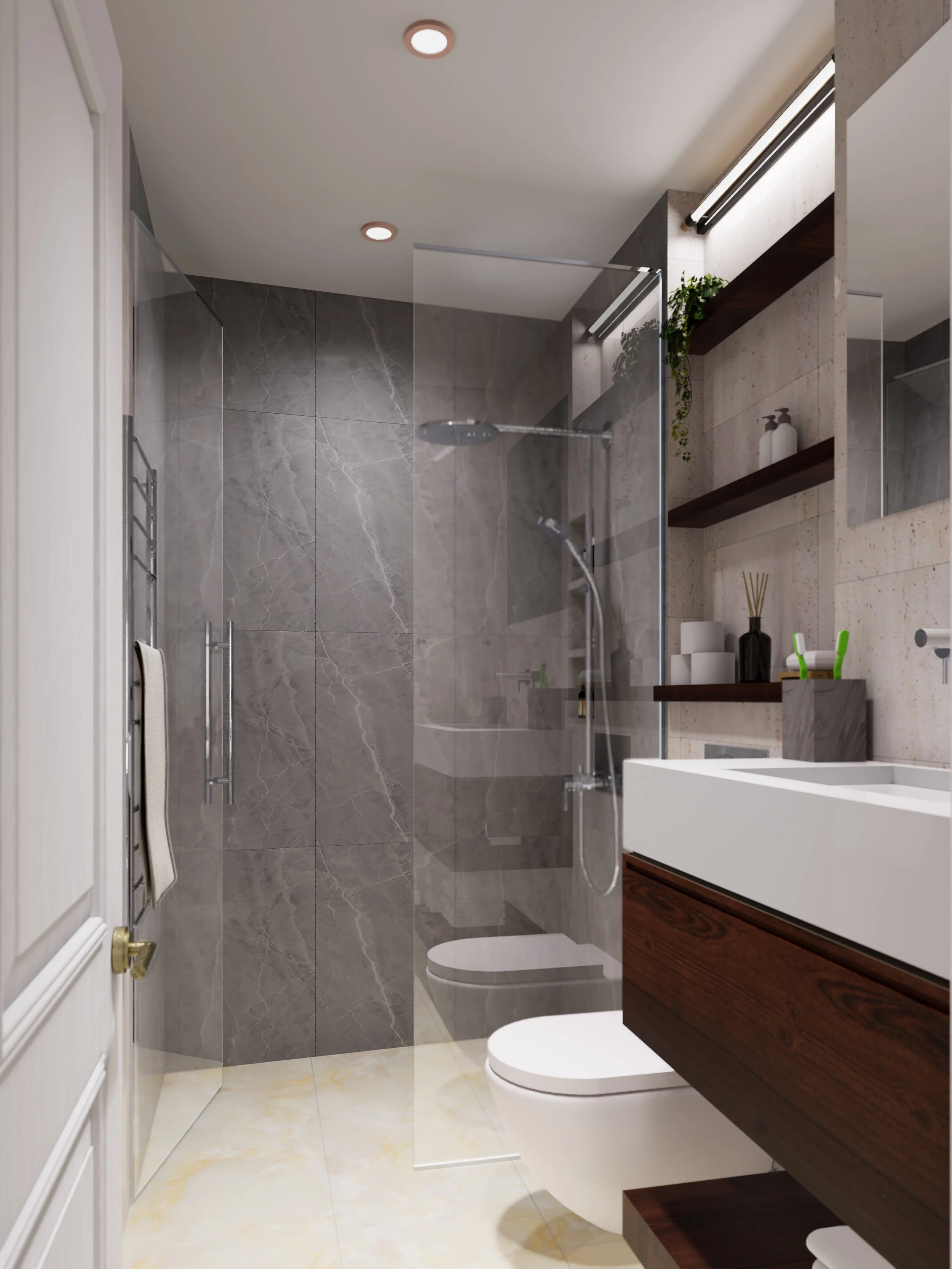 Both spaces are finished with light-toned porcelain and natural stone, creating a clean and calming atmosphere. Grey tiles in the shower area contrast beautifully with the warmth of the wooden vanity, achieving a harmonious balance of tones and textures.